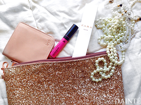 Ker so torbice pogosto izjemno majhne, je njihova vsebina vedno skrbno izbrana. V večerni torbici skrivam samo izdelke v mini oblikah, katere nakupim ob vsakem obisku drogerije. V moji torbici vedno najdeš šminko, parfum, denarnico, robčke, ključ in telefon.