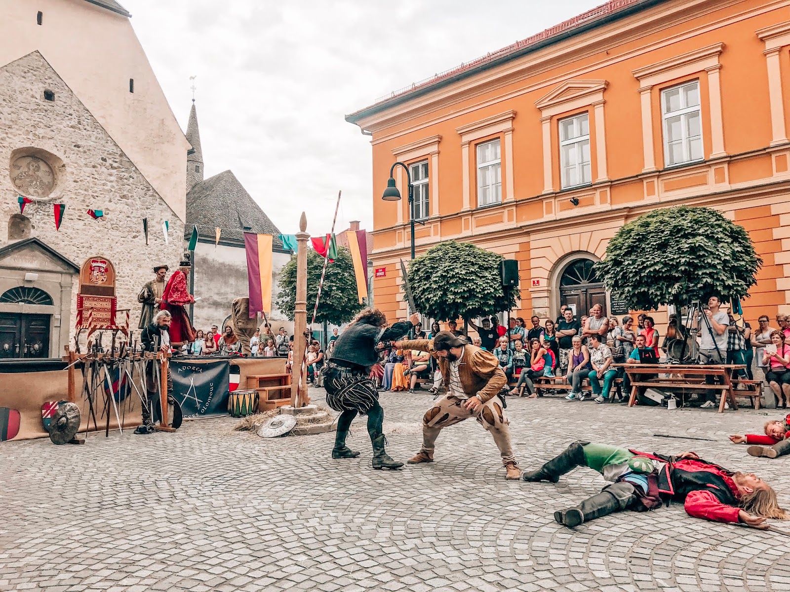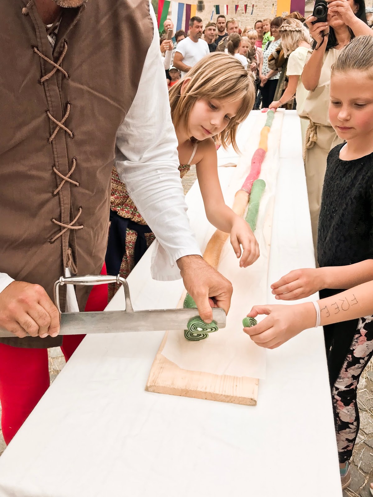 Srednjeveški preludij v Slovenj Gradcu je dogodek, ki ga že več let organizira družinsko podjetje Perger in tako v 21. stoletje prinaša že zdavnaj pozabljene tradicije. Spremljanje evropskih viteških skupin pri borbah, uživanje ob srednjeveški glasbi, pitje medice pri krčmarju, hrustanje medenjakov pri Pergerjih, rezanje giganskega medenega bonbona in sekanje velikega medenjaka, so le nekatere izmed aktivnosti, katerih sem bila deležna na zadnjem festivalu (KLIKNI TUKAJ za program za 15.-16.6.2019). Vstop je brezplačen, kar je za nekoga škrtega kot sem jaz, idealno. Za vse nakupe znotraj trga, pa barantaš s srednjeveškimi novčiči. Na dvodnevnem dogodku je bilo poskrbljeno za čisto vsakega, dogodki pod odrom in na njem, pa so se kar vrstili en za drugim.